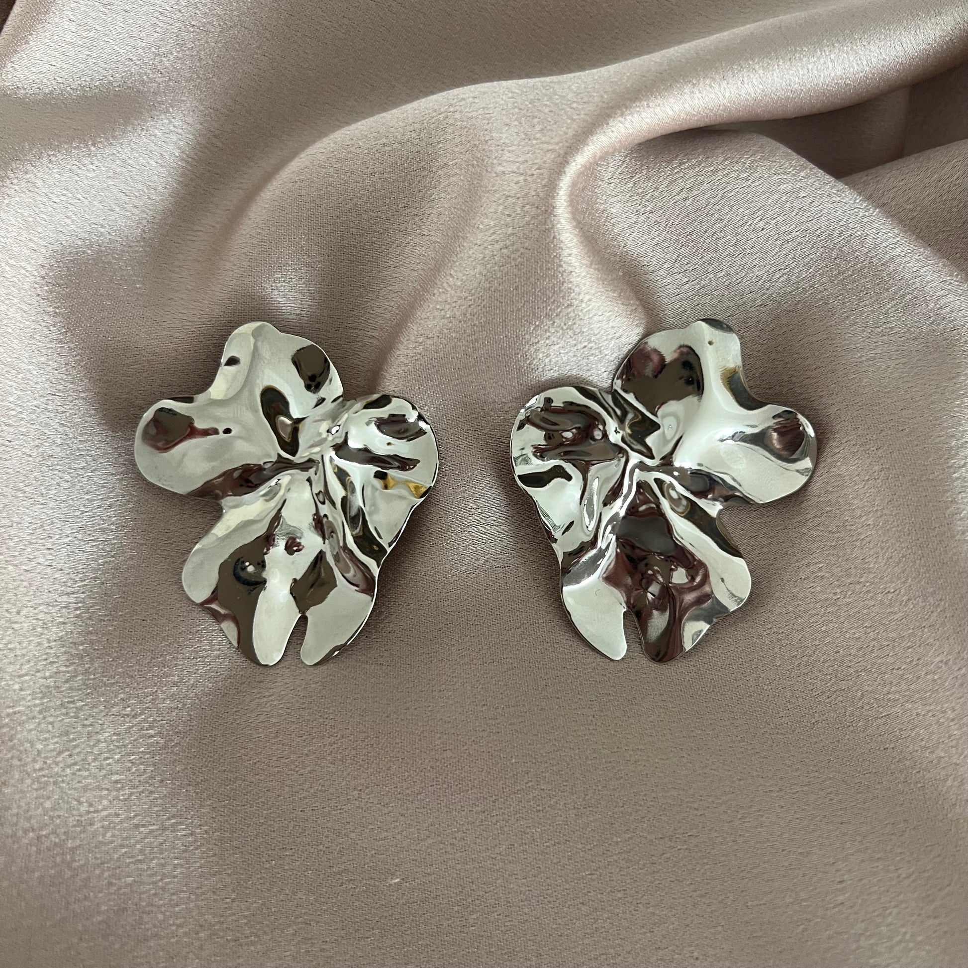 Sculpted like softly folded petals, the Uma Earrings feature an organic, free-form silhouette with a high-shine metallic finish. Their molten texture reflects light beautifully, creating subtle movement and dimension from every angle. Elegant yet modern, these statement studs balance fluid artistry with timeless sophistication—perfect for elevating both everyday looks and evening wear.